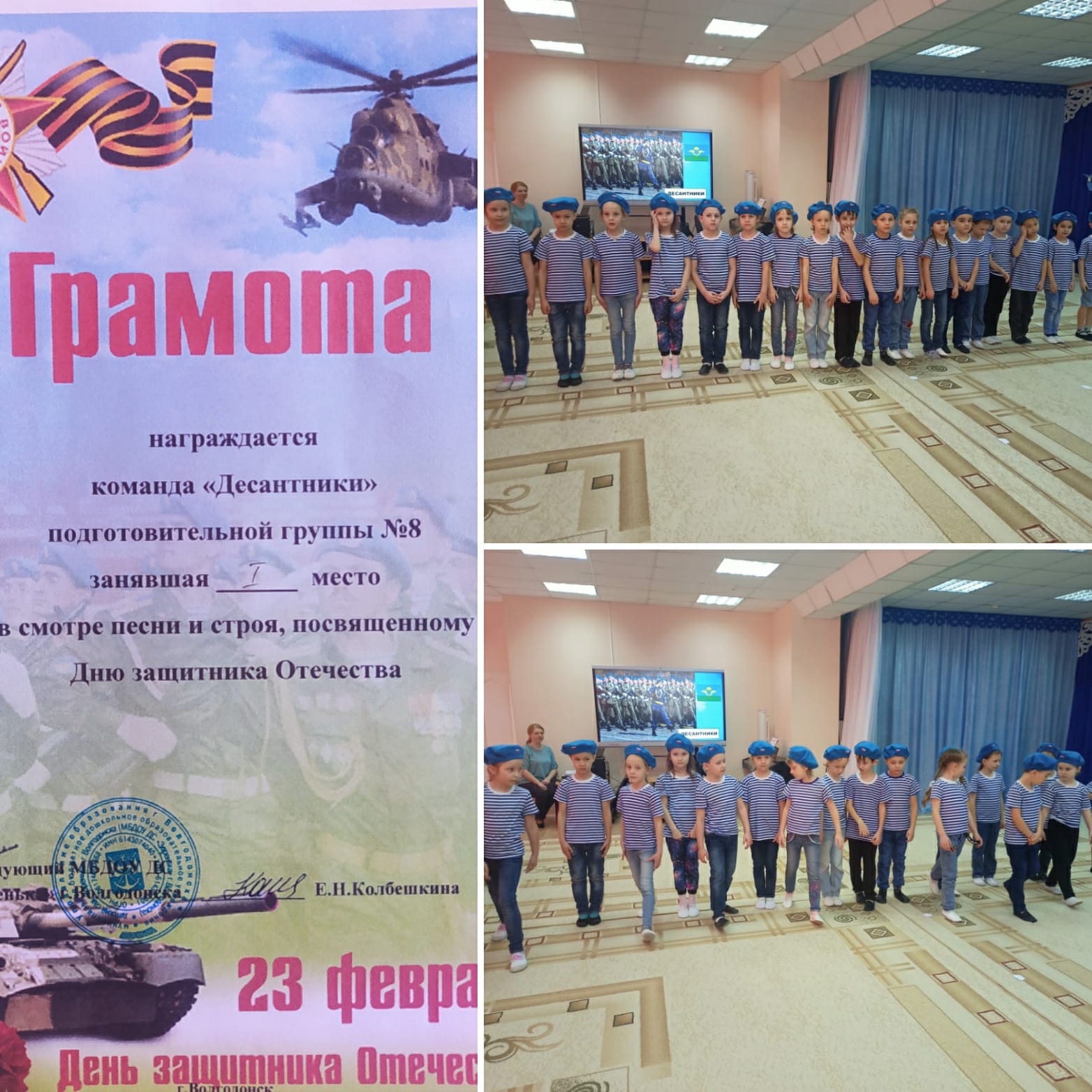 Воспитанники нашей группы приняли участие в смотре - конкурсе строевой песни. Они маршировали, исполняя песню Игоря Русских "Шли солдаты на войну". Наша группа заняла первое место среди подготовительных групп.