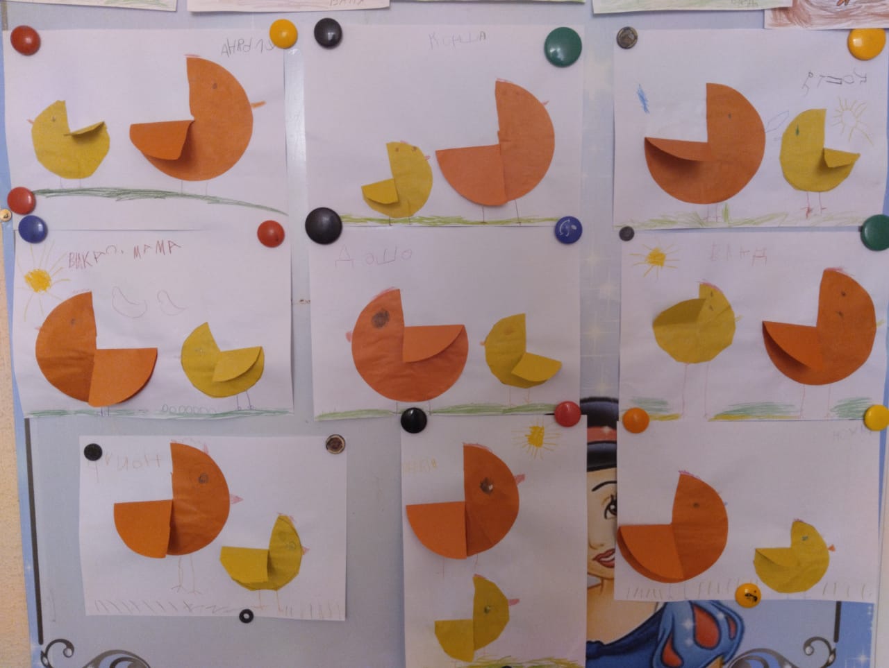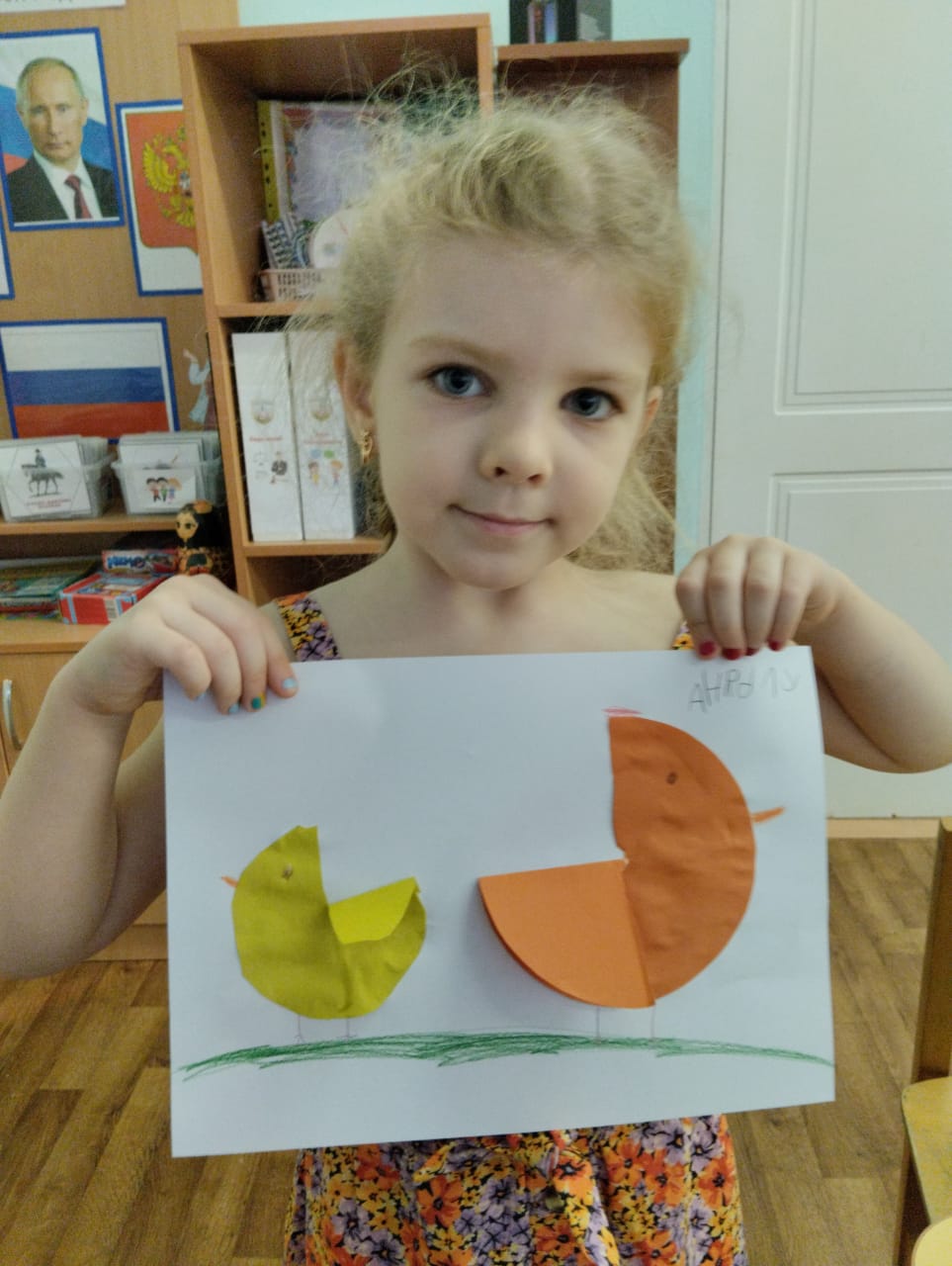 С детьми была проведена беседа о том, какие птицы живут рядом с человеком, какую пользу они приносят, прочитали стихи, потешки, загадки о цыплятах. Дети с удовольствием на прогулке поиграли в игру «Курица и цыплята». В творческой деятельности из цветной бумаги сделали аппликацию «Курица и цыпленок».