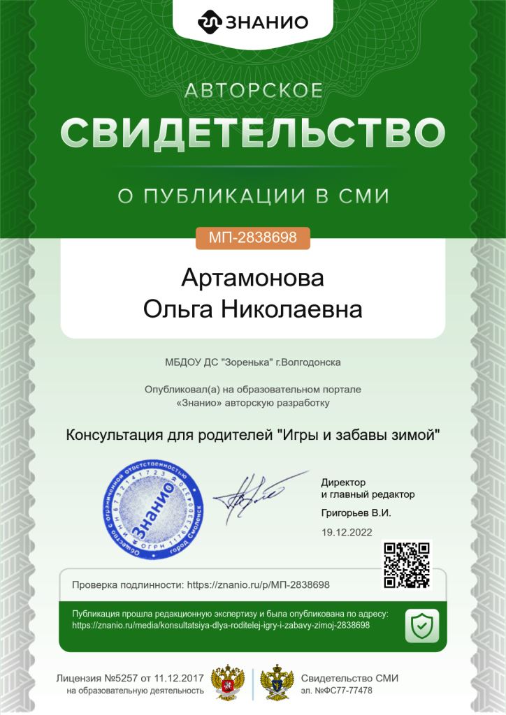 Публикация "Игры и забавы зимой", образовательный портал "Знанио", 2022г. (Свидетельство)